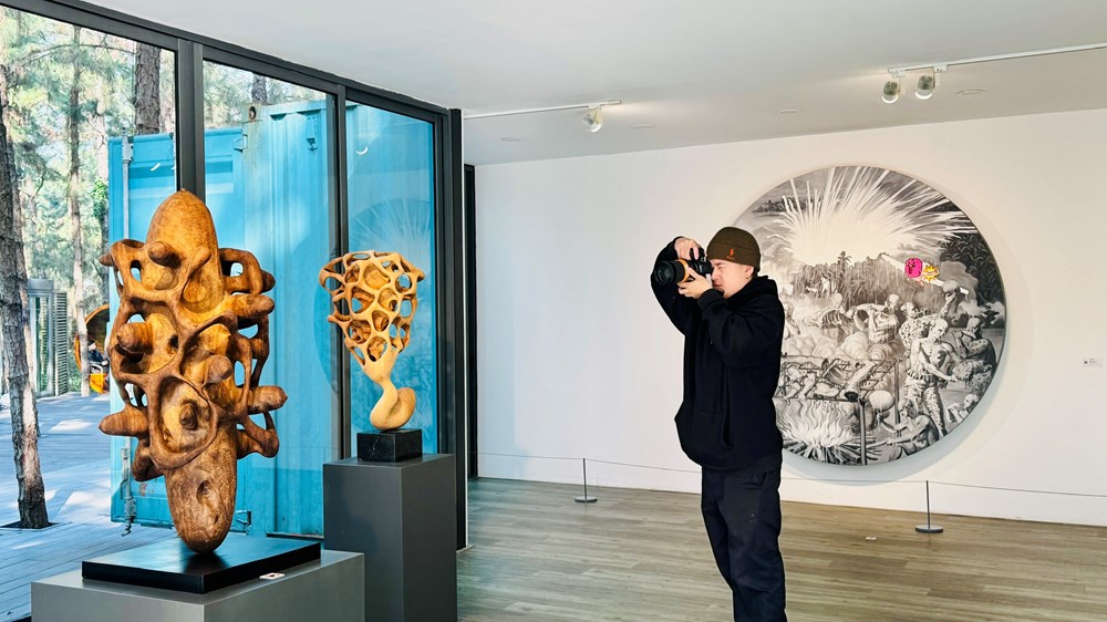 Inside the pine-wooded “container gallery”, paintings, smaller sculptures, and mixed-media installations wait quietly. The contrast between these indoor works and the wildness outside draws attention: art doesn’t just decorate space — it dialogues with it.