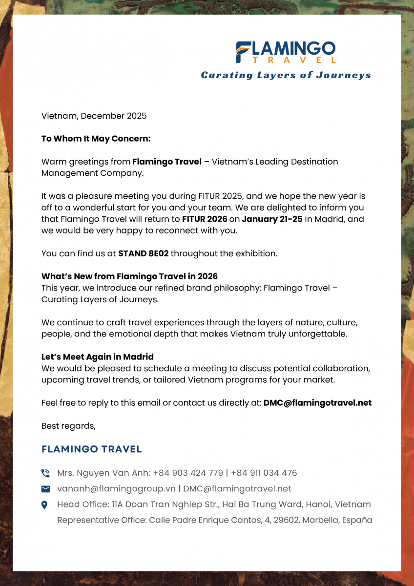 December 9, 2025As one of Vietnam’s leading destination management companies, Flamingo Travel is set to return to FITUR 2026, bringing a fresh vision of Vietnam’s most evocative travel experiences to the global stage. The international travel and tourism trade fair will take place from January 21–25, 2026, in Madrid, Spain, and Flamingo Travel will welcome partners, buyers, and industry professionals at Stand 8E02 throughout the event.