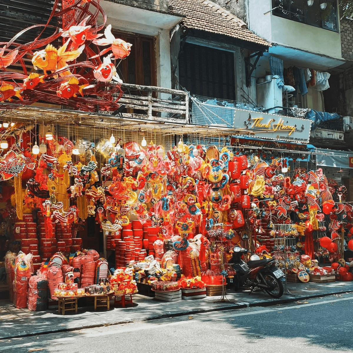 In the capital city, Tết Trung Thu brings the streets alive with sound, color, and excitement. Hàng Mã Street, nestled in Hanoi’s Old Quarter, becomes a dazzling spectacle of lanterns, masks, and festive toys. Vendors line the narrow road, their stalls glowing with every color imaginable — red for luck, gold for prosperity, and blue for peace. Families stroll beneath the lanterns, while the rhythmic beats of lion drums echo around Hoàn Kiếm Lake.